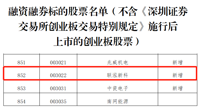 2022年10月21日,深圳證券交易所發(fā)布《關(guān)于擴大融資融券標的股票范圍的通知》,聯(lián)泓新科(SZ. 003022)入選融資融券標的股票。本次調(diào)整將于2022年10月24日起實施。