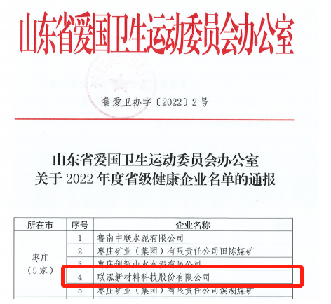 12月19日,山東省愛(ài)國(guó)衛(wèi)生運(yùn)動(dòng)委員會(huì)辦公室通報(bào)2022年度省級(jí)健康企業(yè)名單,聯(lián)泓新材料獲評(píng)“2022年度省級(jí)健康企業(yè)”。
