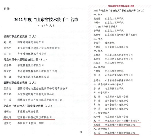 近日,山東省人力資源和社會(huì)保障廳、棗莊市人力資源和社會(huì)保障局分別公布了2022年度“山東省技術(shù)能手”名單、2022年度“棗莊市技術(shù)能手”名單。憑借在2022年棗莊市“魯班傳人”職業(yè)技能大賽的突出表現(xiàn),聯(lián)泓新材料檢驗(yàn)檢測(cè)中心魏秋連被授予2022年度“山東省技術(shù)能手”榮譽(yù)稱號(hào),檢驗(yàn)檢測(cè)中心龍華、程利霞、張芳3名員工被授予2022年度“棗莊市技術(shù)能手”榮譽(yù)稱號(hào)。