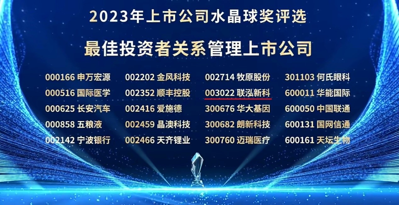 2023年12月29日,《證券市場(chǎng)周刊》2023年上市公司水晶球獎(jiǎng)評(píng)選榜單揭曉,聯(lián)泓新科董事長(zhǎng)、總裁鄭月明獲評(píng)“2023年度最佳總裁/總經(jīng)理/CEO”,聯(lián)泓新科獲評(píng)“2023年最佳投資者關(guān)系管理上市公司”。