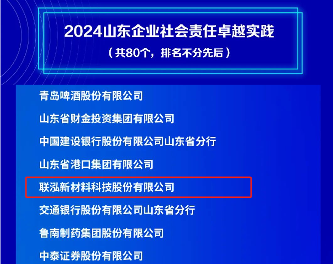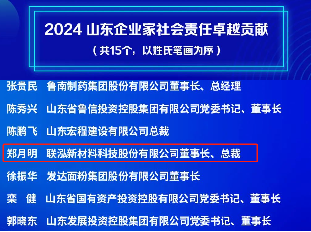 2024年12月27日,“2024山東企業(yè)(企業(yè)家)社會責(zé)任”展示活動結(jié)果揭曉,聯(lián)泓新材料董事長鄭月明榮獲“2024山東企業(yè)家社會責(zé)任卓越貢獻”。聯(lián)泓新材料入選“2024山東企業(yè)社會責(zé)任卓越實踐”。